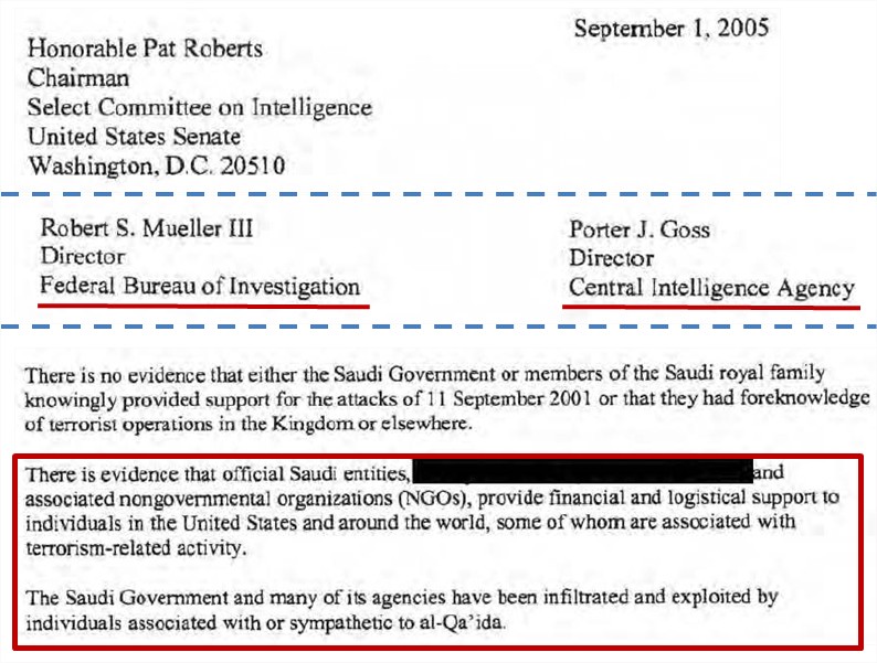 - MAIS qu’il y a des preuves de la participation d’entités officielles saoudiennes et d’ONG saoudiennes, et que le gouvernement saoudien a été infiltré et exploité par des individus associés ou sympathisants d’al-Qaïda !!!